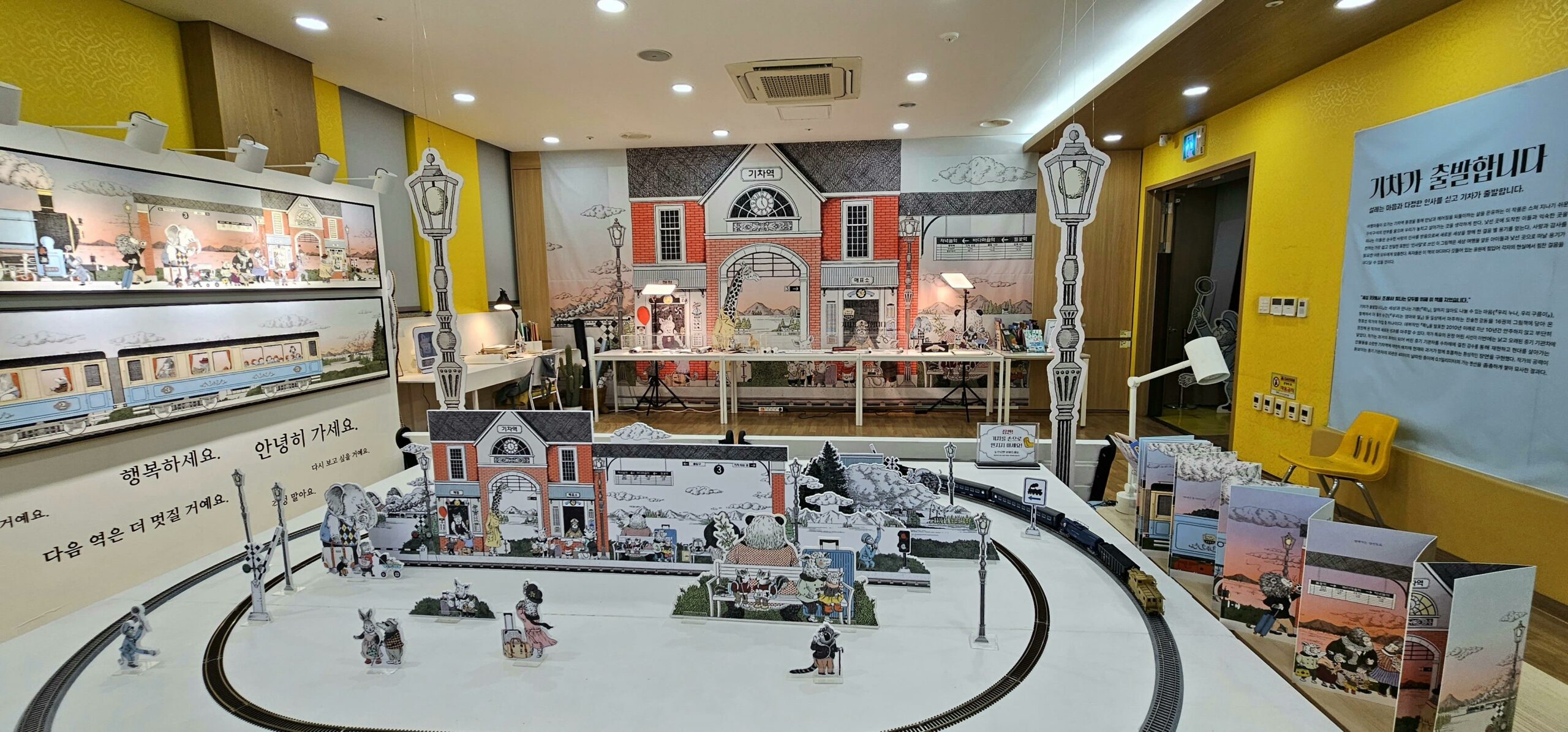 그림책 <기차가 출발합니다> 속 기차 원화를 길이 7m의 대형 전시물로 만날 수 있고 ‘기차 모형 마을’, 작가의 작업 과정이 고스란히 담긴 ‘작가의 방’, 새로운 시작을 응원하는 그림책 큐레이션 ‘기차마을 도서관’ 등 흥미진진한 코너로 구성되었다.