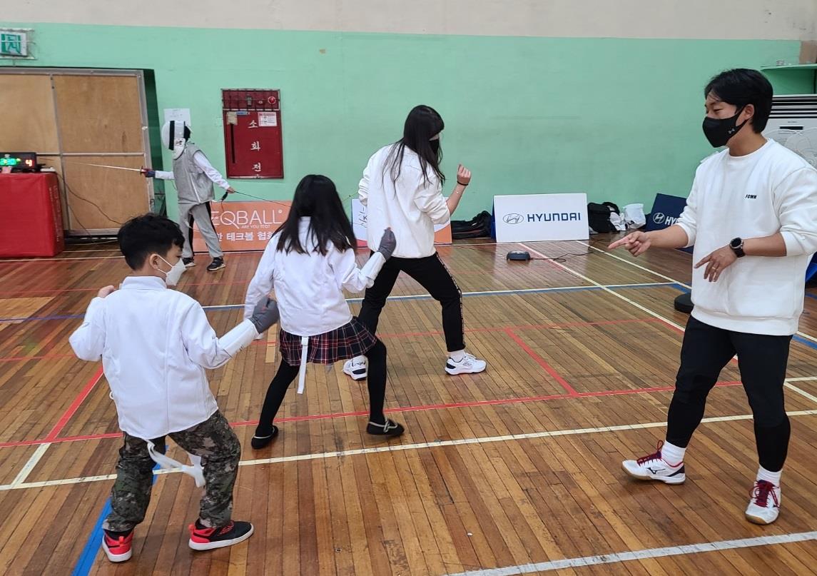선수 출신 강사가 펜싱 종목별 이론과 동작 교육, 실전 대련까지
