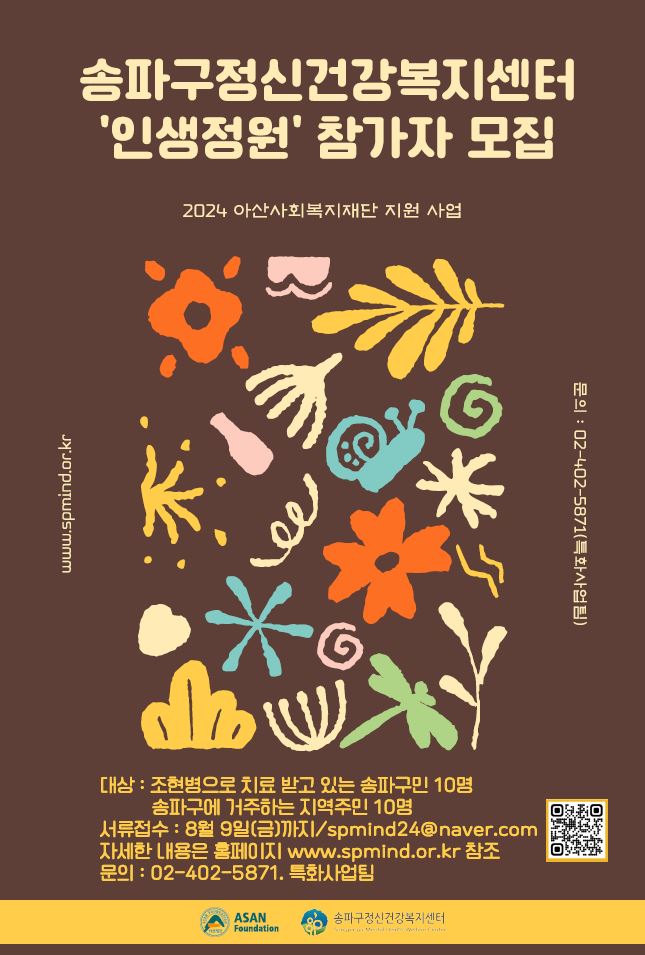 송파구(구청장 서강석)가 위탁 운영하는 송파구정신건강복지센터(센터장 이중선)가 오는 8월 9일까지 ‘인생정원’ 사업 참가자 20명을 모집한다.