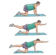 네발기기자세에서 척추는 중립자세를 유지하게 한다 이때 한손을 바닥에서 들어올린다 다른팔과 번갈아가면서 시행한다.